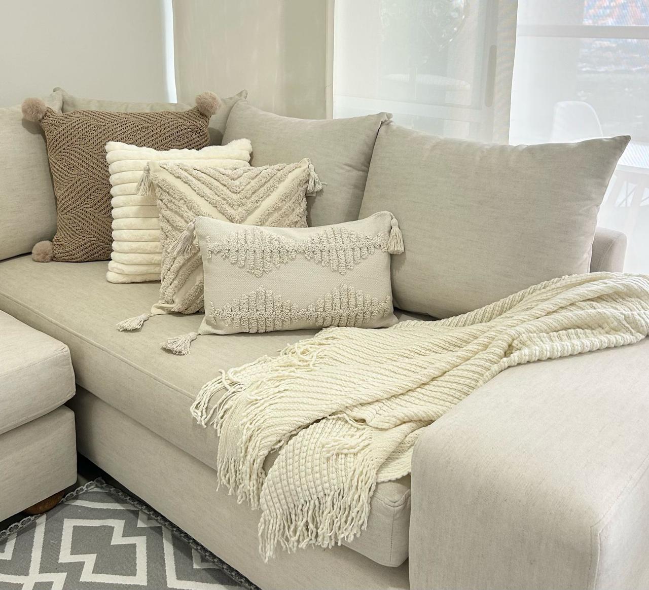 Puedes mezclar varios diseños de cojines y mantas que tambien encontraras en nuestra pagina web, lograras transformar tus espacios con pequeños detalles.